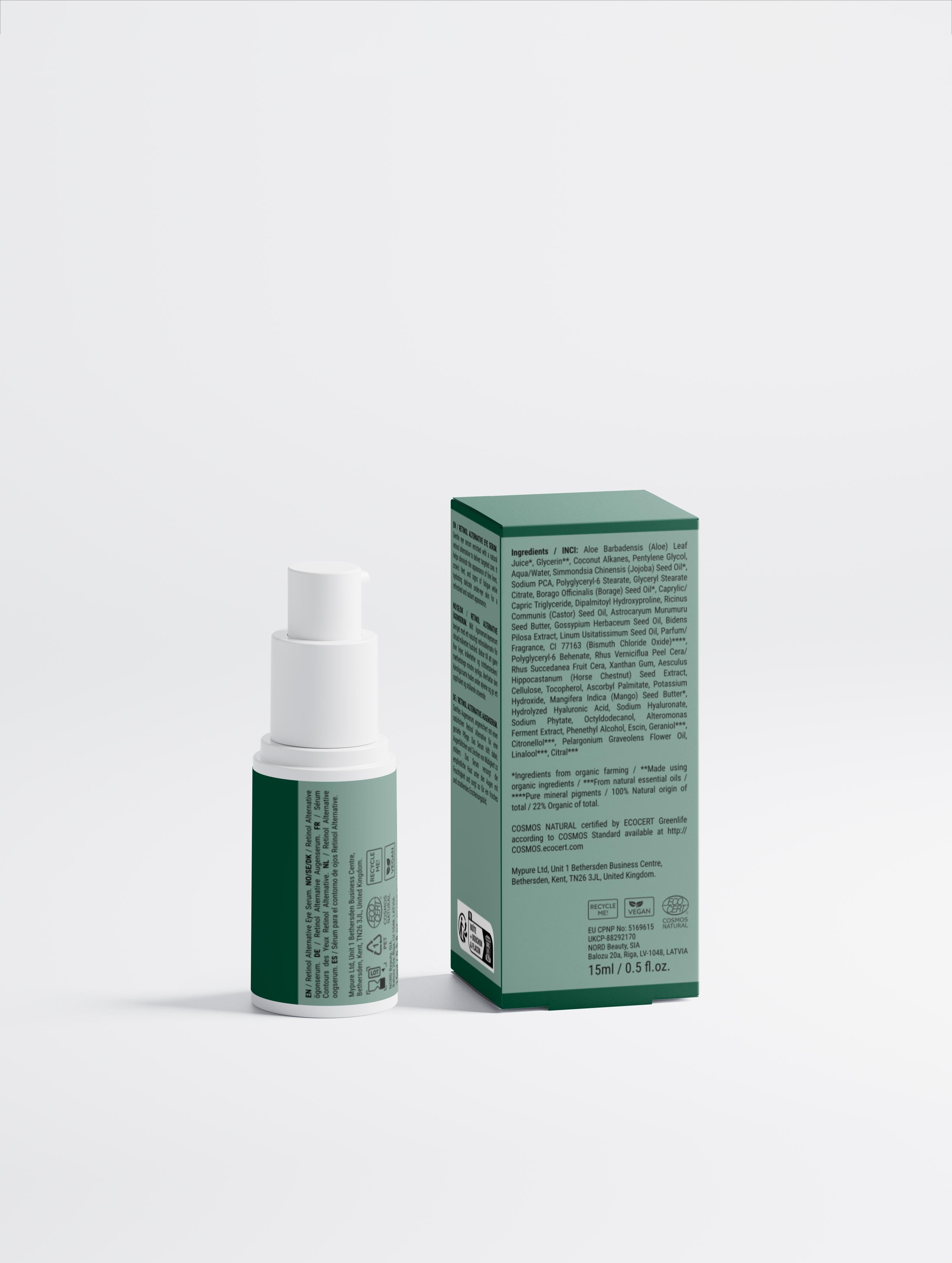 An excellent solution to meet the growing demand for effective yet gentle anti-aging products. By including a natural alternative to retinol, you can offer a high-performance product without the negative side effects often associated with traditional retinol. Description: This gentle eye serum delivers powerful, targeted care for the delicate skin around your eyes. Formulated with a natural retinol alternative, Bidens Pilosa extract, it works to diminish the appearance of fine lines, crow’s feet, and signs of fatigue without the irritation of traditional retinol. Whereas a blend of hyaluronic acid, aloe juice, and jojoba and castor oil provides deep hydration to the under-eye area for a refreshed and radiant appearance. Gentle retinol alternative, Reduces the appearance of fine lines, face-care, Eye cream (Type), Anti-age (Concern), Under-eye fatigue (Concern), All skin types (Skin type), Vitamin C (Active ingredients), Vitamin E (Active ingredients), Retinol Alternative (Active ingredients), Hyaluronic Acid (Active ingredients), Aloe Juice (Active ingredients), Sodium PCA (Active ingredients), White (Packaging color) Aloe Juice Sodium PCA Vitamin C Hyaluronic Acid Vitamin E Bidens Pilosa Extract (Retinol Alternative) Jojoba Oil Castor Oil Aloe Barbadensis (Aloe) Leaf Juice➀, Glycerin➁, Coconut Alkanes, Pentylene Glycol, Aqua/Water, Simmondsia Chinensis (Jojoba) Seed Oil➀, Sodium PCA, Polyglyceryl-6 Stearate, Glyceryl Stearate Citrate, Borago Officinalis (Borage) Seed Oil➀, Caprylic/Capric Triglyceride, Dipalmitoyl Hydroxyproline, Ricinus Communis (Castor) Seed Oil, Astrocaryum Murumuru Seed Butter, Gossypium Herbaceum Seed Oil, Bidens Pilosa Extract, Linum Usitatissimum Seed Oil, Parfum/Fragrance, CI 77163 (Bismuth Chloride Oxide)➃, Polyglyceryl-6 Behenate, Rhus Verniciflua Peel Cera/Rhus Succedanea Fruit Cera, Xanthan Gum, Aesculus Hippocastanum (Horse Chestnut) Seed Extract, Cellulose, Tocopherol, Ascorbyl Palmitate, Potassium Hydroxide, Mangifera Indica (Mango) Seed Butter➀, Hydrolyzed Hyaluronic Acid, Sodium Hyaluronate, Sodium Phytate, Octyldodecanol, Alteromonas Ferment Extract, Phenethyl Alcohol, Escin, Geraniol➂, Citronellol➂, Pelargonium Graveolens Flower Oil, Linalool➂, Citral➂ ➀Ingredients from organic Farming ➁Made using organic ingredients ➂From natural essential oils ➃Pure mineral pigments